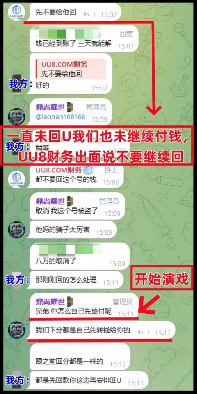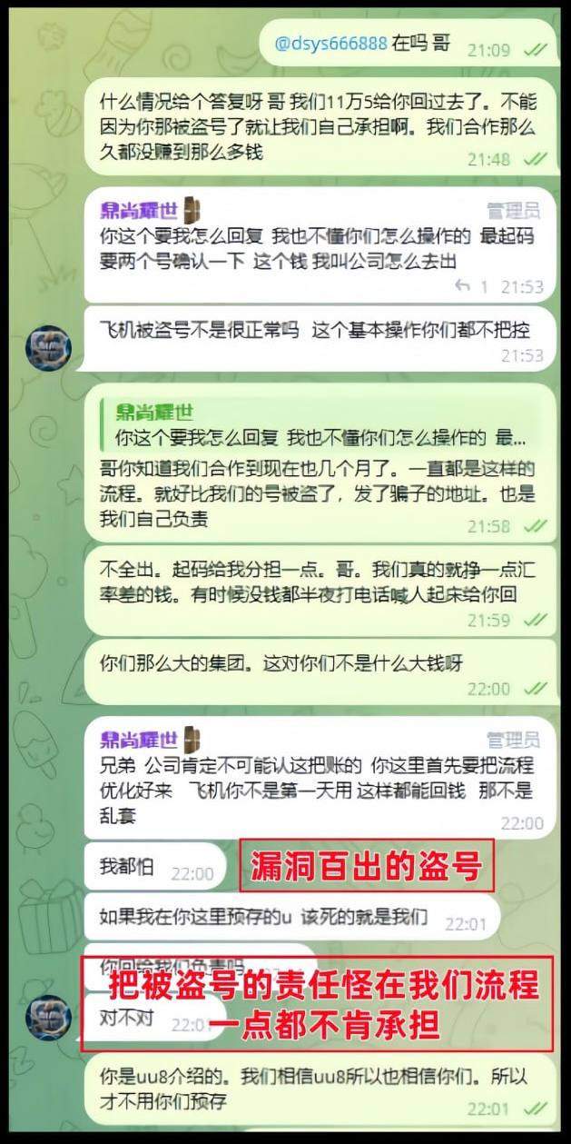 我是U商,经 #UU8(菠菜网站)介绍,对接了在吾圈APP开PC28群的鼎尚国际,帮他们代付玩家的下分赚取汇率差,在12月7号,在我们付完款后的不久说飞机号被盗,回款并非本人发的为由不给我回U