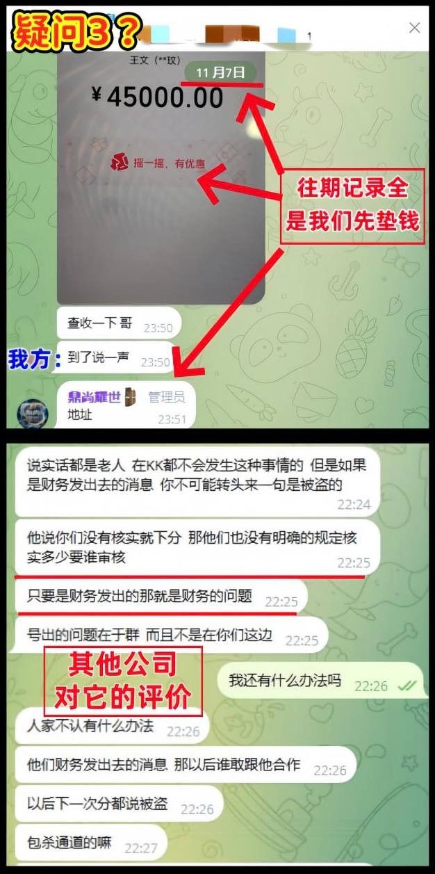 疑问2:12月7号中午14:27分让我方回款11万5,我方14:56分回款完毕,14:58催促鼎尚打U,接着让我们继续回款8万(此时没收到U我们也不会继续打的了,因为平时挂给他们的额度也都是10万左右),15:07分UU8财务在群里发言说不要回款